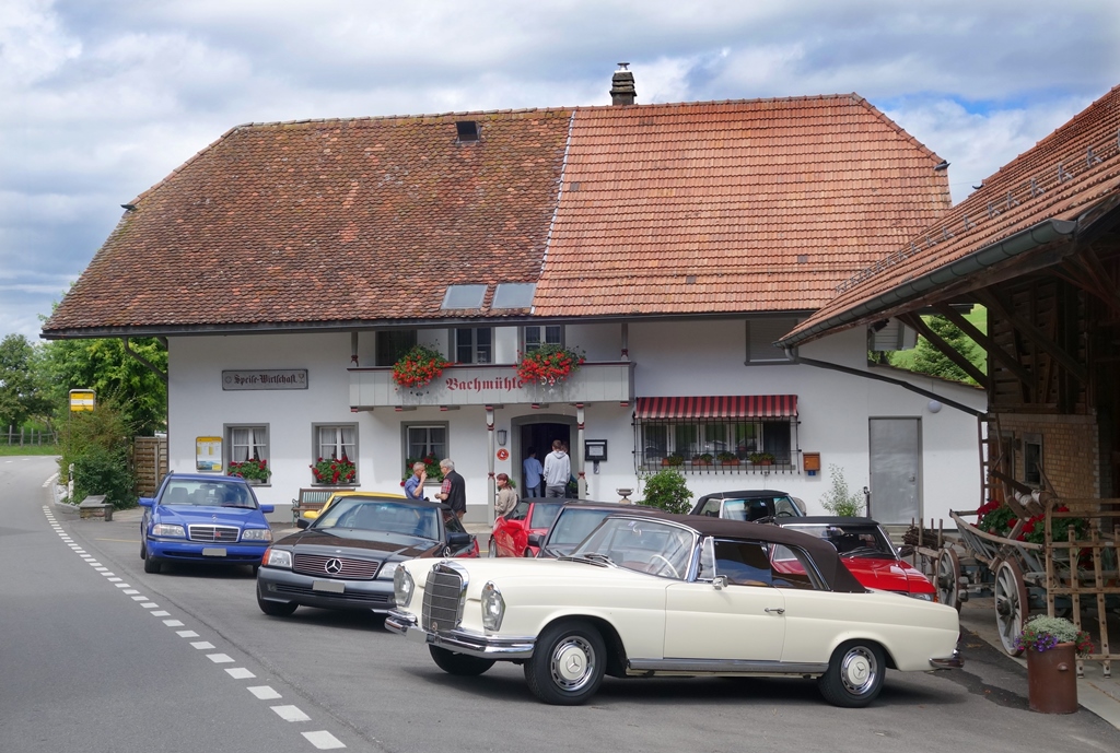 Nach dem feinen Mittagessen ging es um 14:00 Uhr weiter dem Längenberg entlang Richtung Riggisberg, Wattenwil, über Blumenstein ins Stockental. Über Amsoldingen, Thierachern, Uetendorf gelangten wir – die Aare überquerend – nach Heimberg und weiter nach Steffisburg. Nun hiess es ein oder zwei Gänge – je nach Baujahr – zurückschalten. Die Strasse nach Fahrni verläuft recht steil. Oben angekommen genossen wir einen herrlichen Ausblick auf die Berner Alpen. Es folgten Dörfer wie Unter- und Oberlangenegg, Süderen Oberei, Röthenbach und Eggiwil. Hier stand in der Wegbeschreibung rechts abbiegen. Aber von einem Bergpreis stand da nichts. Auf einer wunderschönen Alpstrasse gelangten wir zum Ziel der Berner Ausfahrt, dem Restaurant Blapbach 1120 m. ü.M. Nebst der herrlichen Rundsicht erwartete uns hier ein typisches Emmentaler Zvieri; Merängge mit Nidle (Meringues mit Schlagrahm).