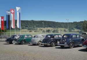 So fuhren wir am Sonntag, 17. Juli 2022 Richtung Weiach und verliessen die Strasse am Kreisel nach Fisibach. Auf dieser Nebenstrasse war unser Ziel bereits signalisiert und wir trafen auf dem grossen Parkplatz ein, wo nach einer Sternfahrt bereits etliche Chassistypen in der Sonne glänzten. Nach gegenseitiger Begrüssung und Bewunderung der herausgeputzten Fahrzeuge bei bereits fast 30° und strahlender Sonne, war es Zeit, in der Cafeteria Platz zu nehmen. Gipfeli wurden serviert, Kaffee oder Tee musste man an der Theke holen. Dann rief Doris‘ «Guuge» und es folgte eine Begrüssung und die Verkündigung, dass wir die Ausstellung ohne Führung frei besichtigen können. Wer wollte, konnte ein Audiogerät mit Kopfhörer abholen und bei jedem Exponat Geschichte und Spezifikation ganz genau erfahren.