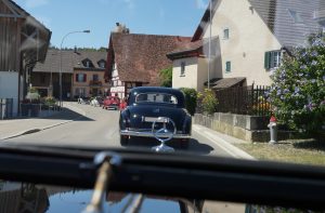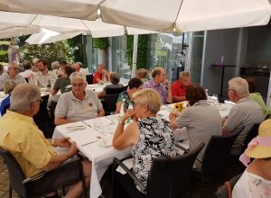Nach Dessert und Kaffee rief Doris zu ihrem Schlussplädoyer und machte nachdrücklich darauf aufmerksam, dass diese Art von Ausfahrt nur weiter bestehen kann, wenn auch andere Teilnehmer einmal selbst aktiv werden und die eine oder andere Organisation in die Hand nehmen. Sie ist nämlich spontan eingesprungen für abgesprungene Organisatoren und hat kurzfristig diese Ausfahrt auf die Beine gestellt – wie bereits dies Trudy vor zwei Jahren gemacht hat. Abschliessend bedankte sich Doris bei den Teilnehmenden dafür, dass sie ihre alten Fahrzeuge pflegen und sie bei diesen hohen Temperaturen pannenfrei hierhergefahren sind. Ein spezieller Dank gilt dem Team der Propstei Wislikofen, das auf alle Änderungen sehr flexibel und zuvorkommend reagiert und uns köstlich bewirtet hat.