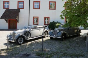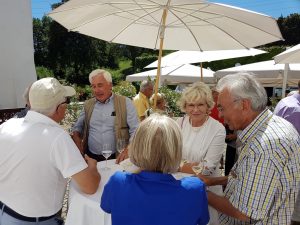 Bei der Propstei in Wislikofen angekommen parkierten wir in mehreren Blöcken, zum Teil unter Schatten spendenden Bäumen. Dann ging es in den Klosterhof zum Apéro. Jede und jeder fasste sein Getränkeglas und suchte einen Schattenplatz bei den Stehtischen unter einem Sonnenschirm. Es war, nach einigen verregneten Chassistypen-Ausfahrten endlich wieder einmal ein echter Hochsommertag!