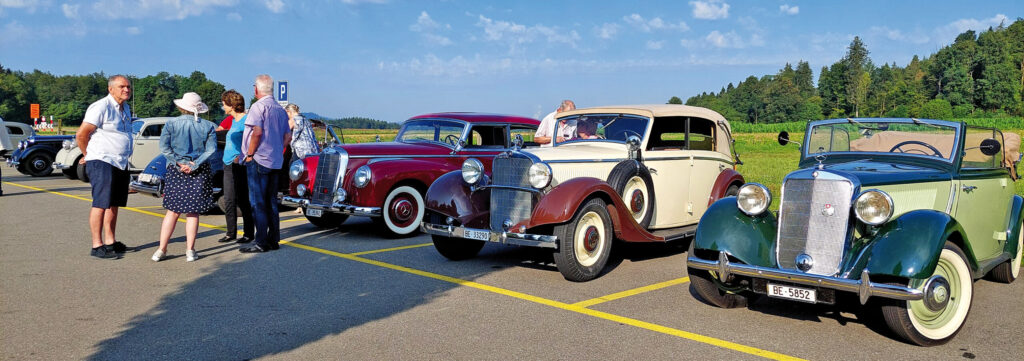 Anschliessend fuhren wir nach Nottwil ins «Hotel & Conference Center Sempachersee». Nachdem ich den Zimmerschlüssel erhalten hatte, machte ich mich über einen Korridor auf den Weg zum Hotelzimmer. Den Rückweg zum Apéro traten wir über ein anderes Verbindungsstück im Gebäude und in einem anderen Lift an – und kamen mit fünf Minuten Verspätung zu unserem kühlen Getränk. Der Weisswein und das feine Plättli draussen im Schatten waren einfach super. Georges nutzte die Zeit und erzählte uns, dass er mit dem Mercedes-Benz 170 V Cabriolet B den Club gegründet hatte, der heute Philipp gehört, welcher auch an der Ausfahrt teilnahm. Georges dankte Heinz für die gute Organisation der Ausfahrt und überreichte ihm einen hölzernen Briefbeschwerer mit MBVC-Plakette. Die Zeit verflog im Nu und wir durften im Speisesaal Platz nehmen. Wir waren uns beim Menü jedoch nicht sicher, ob im Aargauer Braten nicht doch eine Luzerner Zwetschge gesteckt hatte. Nach dem Dessert sprach Klaus Sigloch, Typenreferent des MVC für die Baureihen 290 und 320, noch einige Worte und liess die von ihm verfassten Bücher, welche er zum Verkauf anbot, herumreichen. Anschliessend gab es noch einen «Schlummertrunk» draussen im Garten.