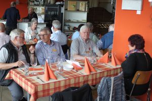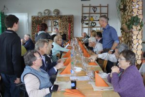 Nach dem reichhaltigen Essen mit anschliessendem Dessert-Buffet, stellt Roland seine besonderen Gäste vor: Erst die neuen Mitglieder, dann den ältesten, über 90 Jahre alten Teilnehmer sowie das Wirte-Ehepaar, das selbst zu Wort kommt. Endlich einmal Landwirte, die nicht jammern! Klar, hat ihnen der Februar-Frost eine Woche Spargelernte vernichtet, die Reben sind, wie die Obstbäume, mehrheitlich für diese Saison zu vergessen. ABER: Wer geschickt diversifiziert, auch auf andere Nischen setzt, wie Honig, Hühnerzucht, Milchproduktion, Restaurationsbetrieb mit Spezialitäten wie hausgemachter Glacé, Sonntagsbrunchs, usw., braucht nicht zu jammern, sondern berichtet, dass harte Arbeit in der Familie mit guten Mitarbeiterinnen und Mitarbeitern ihre Früchte trägt.