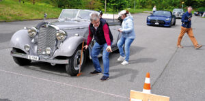 Kurz vor Maienfeld, bei der Festung Sankt Luzisteig, folgte die nächste «Überraschung». Hier wurden die Teilnehmer auf den grossen Parkplatz der Kaserne gelotst und es galt, die erste Prüfungsaufgabe zu lösen. Mit dem eigenen Fahrzeug musste eine Strecke von 15 Metern in exakt zehn Sekunden zurückgelegt werden. Nach Ablauf der zehn Sekunden wurde der Oldtimer angehalten und die noch verbliebene Distanz zur Ziellinie gemessen. Der beste Teilnehmer schaffte es bis auf knappe 21 cm Abstand zum Ziel.
