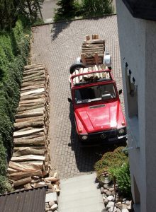 Dann weiter im Kapitel «Arbeitstier»: In Zeiningen hatten wir eine voll auf Holzfeuerung ausgelegte Zentralheizung gehabt. Es hiess also jeden Frühling 10 bis 12 Ster Holz aus dem Wald heim zu schleppen. Natürlich mit dem zuvor entblätterten G-Modell! Informatiker wie wir sind ja Bürogummis mit leichten Fingerübungen während der Arbeit. Welch‘ eine Freude, im Frühling endlich ein Lenkrad in die Finger zu nehmen, das auch die Oberarme beansprucht! Dazu die Militärstiefel anziehen und ab in den Wald. Mit der Legitimation, bereitgestelltes Holz abzuholen, muss man ja im Wald auch nicht den kürzesten Weg nehmen…