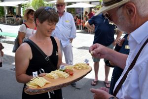 Nächstes Ziel und etwas «gwondrig» ging es beim Adlerplatz zur schmackhaften Dorfführung unter dem Motto «allpott e chli tocke» (immer wieder etwas probieren). Die Degustationen mit Häppchen bei den entsprechenden Stationen waren sehr fein. So gab es einen Apéro mit Käse-, Fleisch-, Back- und Getränkespezialitäten und zum Schluss ein Kapuzinerbitterli zum Probieren.