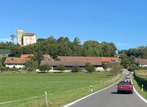 Bald rückt das Schloss Brunegg in Sichtweite und nun wissen alle, dass der Weg nicht mehr weit ist. Nach dem Örtchen Scherz, am Fuss des Burghügels angekommen, bewegt sich die Kolonne von zehn Wagen in geschlossener Formation auf die Habsburg zu. Mit vollem Schwung, einige in den Fahrzeugen stehend und Bilder schiessend, erklimmen die 18 Weibsbilder mit ihren Wagen die steile Strasse, fest entschlossen, nun die Habsburg einzunehmen. Die Gefährte stellen sie ein wenig unterhalb der Burg ab und gehen die letzten Meter zu Fuss. Im Burghof angekommen, werden die dürstenden Frauen mit grosser Gastfreundschaft empfangen, an festlich bereitete Tische geleitet und sie laben sich unter der herrlich strahlenden Sonne an köstlichem Weisswein und Wasser.