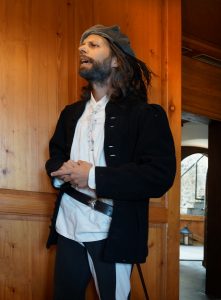 Auf einmal erblicken die holden Ritterinnen eine Gestalt, die aus dem Schatten der Burg hervortritt und Holz sammelt. Sie stellt sich ihnen vor als Bediensteter namens Sebastian. Ganz im Vertrauen erklärt er den Damen, dass sein Herr, der Graf Rudolf von Habsburg, sich soeben nach Altenburg begeben habe zum Schröpfen und er ihnen deshalb heimlich die Burg zeigen könne, wenn sie denn möchten und seinem Herrn nichts davon sagen würden. Mit grosser Neugier folgen sie ihm und klettern zu den Burgmauern hoch und lauschen Sebastians Geschichten. Er erzählt von der Burggründung, von einem Habicht als Namensgeber der Burg, von den Tischmanieren, von den vielen früh verstorbenen Kindern und von Kälte und Hunger auf der Burg in der Winterzeit. Bevor sein Herr zurückkehrt, führt Sebastian die Damen zurück zum Burgtor und nimmt ihnen das Versprechen ab, ihn nicht zu verraten, falls sie später seinem Herrn begegnen sollten.