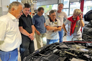 Pro Station waren 50 Minuten vorgesehen. An der ersten Station präsentierten die Trachsler-Mitarbeiter Sandro Le Poulichet, Dani Rodrigues und Michael Truffer vier Fahrzeuge aus vier Generationen, einen Vorkriegs-170er, einen W108 aus den frühen 60ern, eine moderne S-Klasse und einen vollelektrischen EQS. Überraschenderweise war das Interesse auch am jüngsten der vier Fahrzeuge recht gross, bot sich doch hier manchem Teilnehmer erstmals die Möglichkeit, einmal einem reinen Elektroauto unters Blech schauen zu können. Die Kursbesucher erfuhren an dieser Station auch, dass eine moderne S-Klasse über bis zu 120 Steuergeräte verfügt, weshalb eine Fehlerdiagnose heute ohne Werkstattcomputer gar nicht mehr möglich wäre.