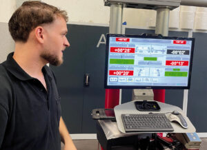 Dementsprechend kamen dann auch Fragen wie «Werden an modernen Fahrzeugen überhaupt noch echte Reparaturarbeiten ausgeführt oder nur noch Baugruppen ausgetauscht?» oder «Inwiefern haben sich das Berufsbild und der Ausbildungsgang eines Automechanikers zwischen früher und heute verändert?». Dass noch nicht alle Arbeiten vom Computer übernommen werden und handwerkliches Geschick auch heute noch gefragt ist, erfuhren dann die Teilnehmer gleich nebenan. Dort konnten sie nämlich selbst aktiv werden. Bei einem GLC sollte eine verstellte Spur an Vorder- und Hinterachse korrigiert werden. Zur Verfügung stand dabei eine computergesteuerte Achsvermessungsanlage der neuesten Generation. Aber die eigentliche Spurkorrektur wird dann doch immer noch von Menschenhand unter Zuhilfenahme eines 19er- und eines 24er-Gabelschlüssels ausgeführt.