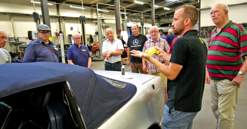 Als erstes erklärte er den gebannt Zuhörenden, welche Voraussetzungen für die Erlangung des Veteranenstatus verlangt werden. Dann waren die Teilnehmer selbst gefordert. Mit Post-it-Notizzetteln sollten sie an zwei Fahrzeugen, einem W201 «Baby-Benz» und einem R129, die «Fehler» markieren, die ihrer Ansicht nach zur Ablehnung des Veteranenstatus führen könnten.