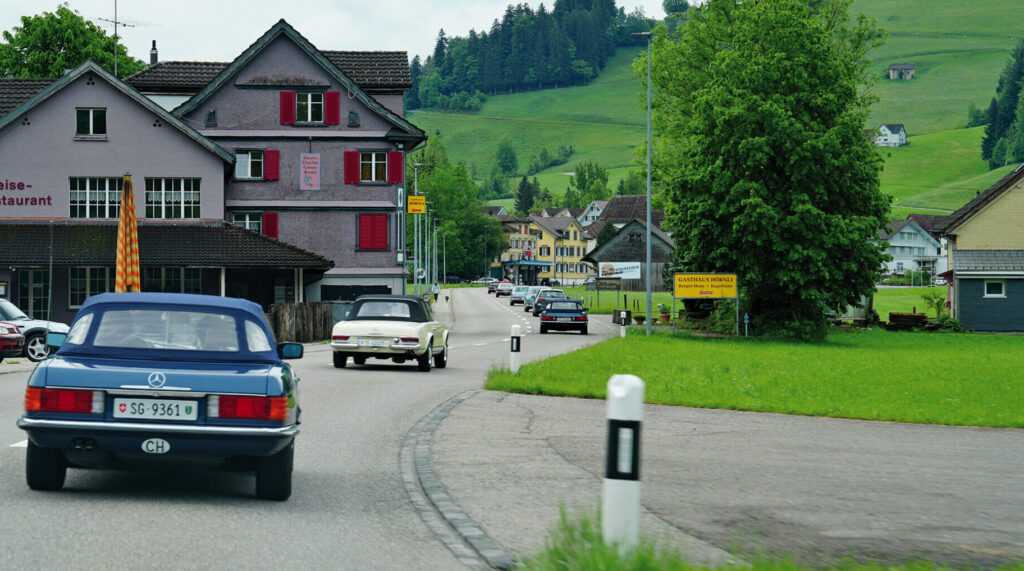 Nach dem Passieren dieser Linie packte mich auch ein wenig Rennfieber. So lockerte ich die Zügel der 200 Pferdchen meines goldenen 107ers, 350 SLC mit Handschaltung. Die Distanz zu meinen Nachfolgern vergrösserte sich und ich konzentrierte mich nicht mehr auf die Tachonadel, sondern auf die schmale Strasse und den richtigen Schaltpunkt in den Haarnadelkurven. Es war ein echtes Vergnügen, das Jubeln des 8-Zylinders zu hören und den Sound zu geniessen!