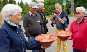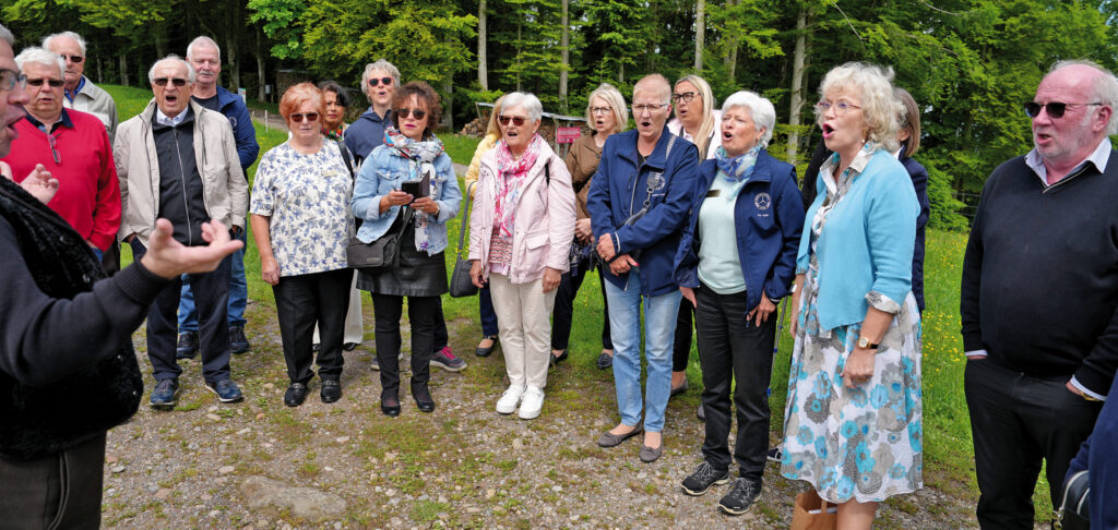 Noch immer gab’s nichts zu trinken, mussten wir uns doch auf den Aussichtspunkt begeben, wo uns nicht nur unser Gesangslehrer Bruno, sondern auch die ersten Sonnenstrahlen begrüssten. Es war beeindruckend, dass Bruno in vierzig Minuten aus dem Nichts einen vierstimmigen Chor so weit brachte, dass wir einen «Naturjodel», ein Lied ohne Worte, darbieten konnten. Ob die stehen geblieben Wanderer auch ohne unser «Zäuerli» stehen geblieben und gefilmt hätten, bleibt offen. Zum Schluss durften wir noch das Talerschwingen lernen und dazu ein «Rugguseli» versuchen.