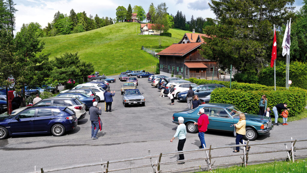 Spätestens vor der scharfen Rechtskurve vor dem Anwesen von Jörg Andreas Kachelmann, Fernsehmoderator und «Wetterfrosch», nahm ich die Zügel wieder straffer an die Hand und genoss den wunderbaren Ausblick zu den Voralpen und zum Säntis – wenn nicht die Wolken dies verhindert hätten! In Hemberg ging es scharf nach links, beim Restaurant Hörnli vorbei, übrigens ein Geheimtipp für Preis/Leistungsverhältnis und eben eine Traumaussicht auf den Säntis inklusive, für alle die dieses Erlebnis nachholen möchten. Übrigens – hier liegt die Ziellinie der neuen Bergrennstrecke Bächli–Hemberg, die wir in gemässigtem Tempo vom Ziel Richtung Start im Bächli befuhren. Nun ging es zügig Richtung Schönengrund, Waldstatt, Haslen, Teufen und kurz danach auf schmalem Pfad steil aufwärts unserem Tagesziel, dem «Schnuggenbock», entgegen. Alle 20 Oldies kamen pannenfrei an diesem wunderschönen Aussichtspunkt an. Mein mitgeführter Werkzeugkoffer kam somit nicht zum Einsatz.