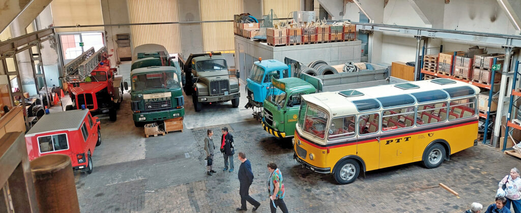In der Fahrzeug-Abteilung empfängt uns Roland Gerber, der es ausgezeichnet versteht, auch die Laien unter uns für die grossartigen Fahrzeuge zu begeistern. Wir bewundern Lkws für die verschiedensten Einsatzbereiche, mit Spezial-Aufbauten und speziellen Anbauteilen, Postautos, Militär- Lastwagen, Motoren in allen Dimensionen – eine lange Entwicklungsgeschichte im Fahrzeugbau, seit hier 1903 der erste Lastwagen konstruiert wurde.