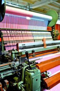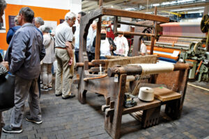 Ernst Kugler übernimmt die Führung durch die Stickmaschinen-Ausstellung. Auf diesen Maschinen werden die unterschiedlichsten Stickmuster lochkartengesteuert maschinell hergestellt. Die Palette reicht von ganz einfach bis sehr ausgefallen, von einfarbig bis knallig bunt – feinste St. Galler Stickerei für exklusive Damenmode, wie sie von Promis wie beispielsweise Michèle Obama getragen wird.