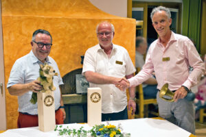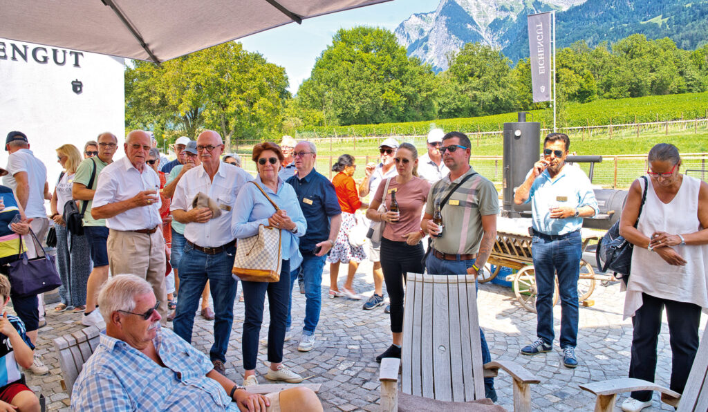 Nach rund 113 Kilometer entspannter Fahrt durch die reizvollen Alpen- und Voralpenlandschaften Graubündens gab es den ersten Halt inmitten der Rebberge der Bündner Herrschaft. Im «Eichengut» in Maienfeld wurden die Teilnehmenden vom Inhaber Philipp Zindel begrüsst. Nach einem erfrischenden Apéro ging’s unter Zindels Führung auf eine interessante Besichtigungstour durch den hochmodernen, ökologisch geführten Landwirtschaftsbetrieb, der in einzigartiger Weise Ackerbau, Rinderzucht, Pferdehaltung, Weinbau und Gastronomie unter einem Dach vereint.