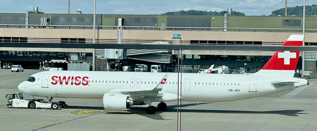 Nach Eintreffen und Kaffee in einem Restaurant von The Circle marschierten wir quer durch einige Flughafenbereiche, um dann mit einem Elektrobus (aus Daimler Truck Joint Venture) zur riesigen Werft gefahren zu werden. Der Anblick der schönen Jets mit dem weissen Kreuz auf dem Heckruder von ganz nahe war einfach überwältigend.