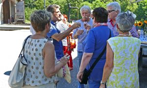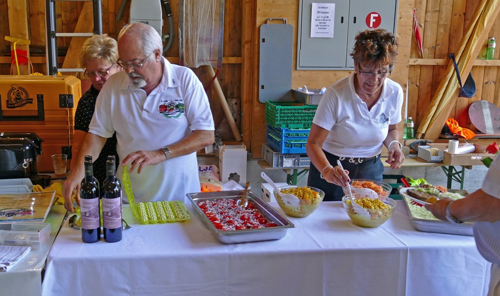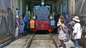 Nach so vielen Geschichten von Eisen, Dampf und Kohlen verspürten auch wir allmählich Kohldampf. Da es Petrus an diesem Sonntag allzu hitzig mit uns meinte, war es nicht möglich, im nostalgischen Speisewagen zu dinieren, die Temperaturen dort stiegen auf Backofen-Niveau. Daher erwarteten uns die festlich gedeckten Tische in der schattigen Remise, wo wir – verwöhnt von der ZMB-Crew – einen gemütlichen Nachmittag mit anregenden Gesprächen verbrachten, immer darauf bedacht, nicht über die Geleise zu stolpern!