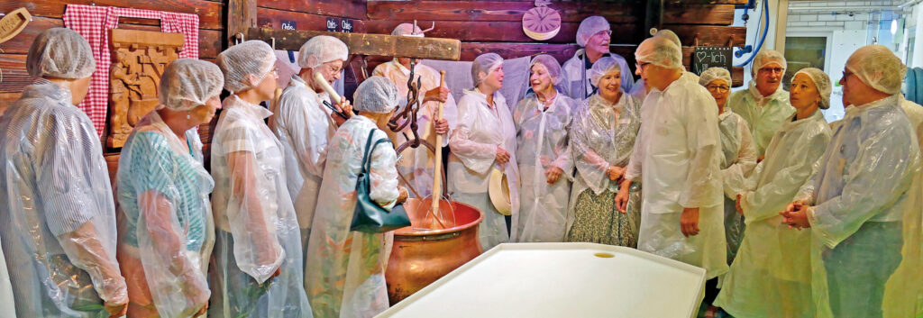 Die Milchmanufaktur, eine Schaukäserei, ist in einem modernen Gebäude untergebracht mit Terrasse für Restaurantgäste und Teilnehmerinnen und Teilnehmer der rund 1’000 Führungen pro Jahr sowie grossem Verkaufsladen für eigene und viele weitere regionale Produkte. Unser kundiger Guide Othmar erklärt die Entstehungsgeschichte dieses erst seit dem Jahre 2015 existierenden Betriebes