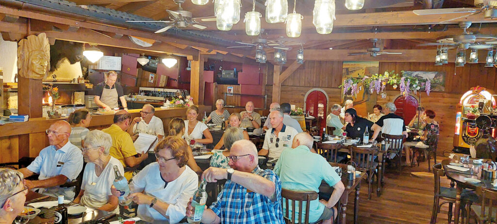 Am grossen Parkplatz stehen bereits einige Mercedes-Benz-Fahrzeuge aus dem frühen sowie aus dem vorherigen Jahrhundert. An der Sonnenterrasse stutzen wir: Lauter fremde Gesichter! Der plötzlich auftauchende Wirt bringt des Rätsels Lösung: «Mercedes-Leute bitte rechts in den Saal». Auch dieser ist bereits recht voll, Donat, der Stammleiter, klärt uns auf: Es sind 22 Anmeldungen eingetroffen für 44 Teilnehmende und keine einzige Absage.
